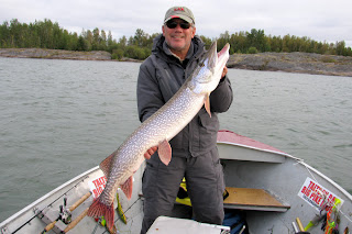 An update from our trip w/e 7/23/11. Another year with anxiety after our gear (rods this time) did not arrive on a direct flight from Chicago. We celebrated near midnight under the sunny sky in Yellowknife as the cabbie delivered our misplaced musky sticks. We arrived in camp to find just Don and his wife there, the staff would be boating in from Fort Resolution later in the day. After a quick breakfast we headed out and found the pike to be just as hungry as they were last year. Gene Somenek, Mark Shiels, and myself landed 140 pike over 40" during the week. Our biggest fish was 47" and we all caught at least one 46. Sharing the lodge with us were two excellent fisherman from Minnesota, Craig and his 12 year old son Jake. They bettered our totals by landing 105 trophies with Jake taking a 47 inch beauty to edge out his Dad for big fish honors. They also caught many nice walleyes up to 26" trolling the river and off the island rocks. Best baits were Johnson Silver Minnows, Grinders, Bulldawgs, and assorted spinnerbaits. Fish were spread out around the islands and throughout the Taltson river itself. The fish were brutal on tackle and people, I broke one extra heavy rod landing a trophy and blew up a new Shimano reel. Also felt the pleasure of a treble pushed into my shin past the hook bend with the brute still attached to it. Maybe next year I'll try full body armor to protect myself better. Had fun trading stories with the young guides and spent a great night in Calgary on the way home. We will return again next year in persuit of the elusive 50" that Gene swears he had on until he didn't. Vic Karlson